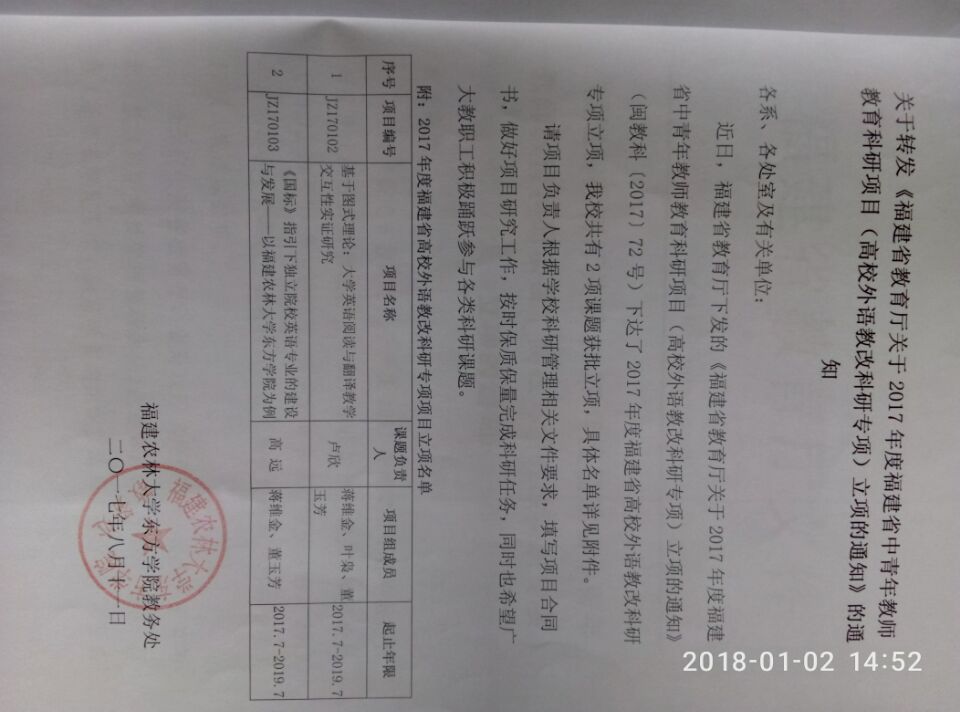 根据教育厅日前下发的《福建省教育厅关于2017年度福建省中青年教师教育科研项目(高校外语教改科研专项)立项的通知》(闽教科〔2017〕72号)下达了2017年省高校外语教学改革专项立项名单,我校共有2项课题获批立项,具体名单详见附件。